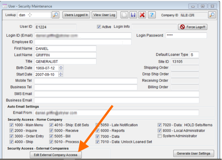 1. In LoanerTrak, click Admin > Users to open the User Maintenance screen. Select a user to add access to. In this example we will use Daniel. Click the Edit External Company Access button.