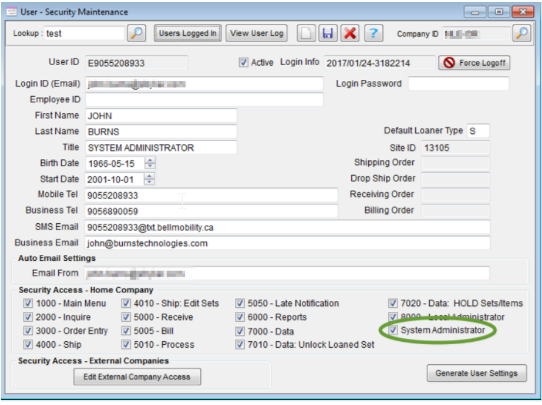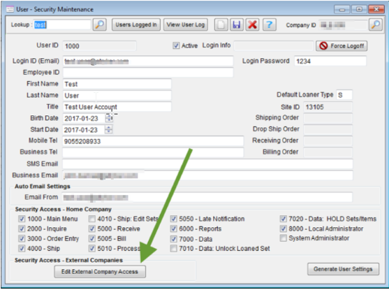 Note: LoanerTrak Administrators have access to all screens in all companies by default.