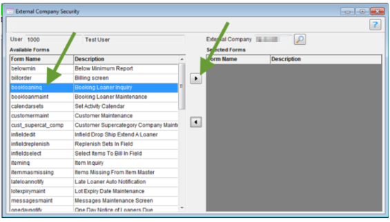 The Booking Loaner Inquiry screen is added to the right window pane. This user, who works in company NLE-OR may now access the Booking Loaner Inquiry screen in the external company chosen.