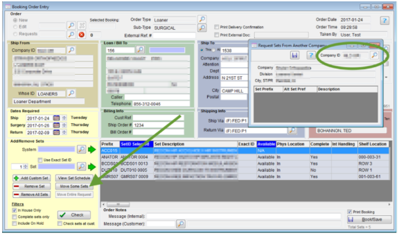 The Order Entry Request Sub Form allows this user to open a booking sub-form and select an external company and drag set(s) to that company, automatically creating a new request in that company.
