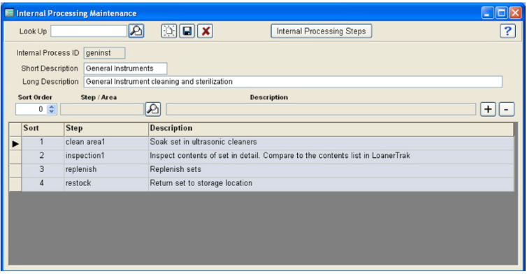 This chapter covers the optional Internal Handling Code function in LoanerTrak. This function is designed to track loaner sets after they have been received back from a customer. Some medical loaner sets require special handling depending on the type of medical device, equipment or tools that are contained in the set, such as cleaning and sterilization.