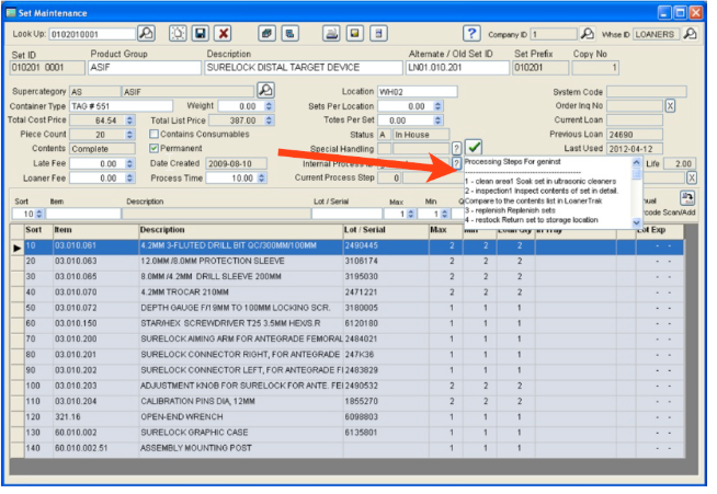 Now that we have an internal process set up, along with its individual steps, we can now attachbit to one or many sets. When a set is being received and it has an internal handling code assigned to it, the program will automatically begin to follow the handling steps at the point of receipt, allowing users to track and move the sets through each handling step.
