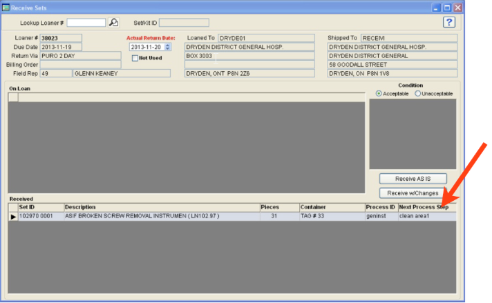 1. When a set is received that has an attached Internal Processing ID, the program will automatically read the first handling step and display it on the receiving screen and Receipt Confirmation reports.